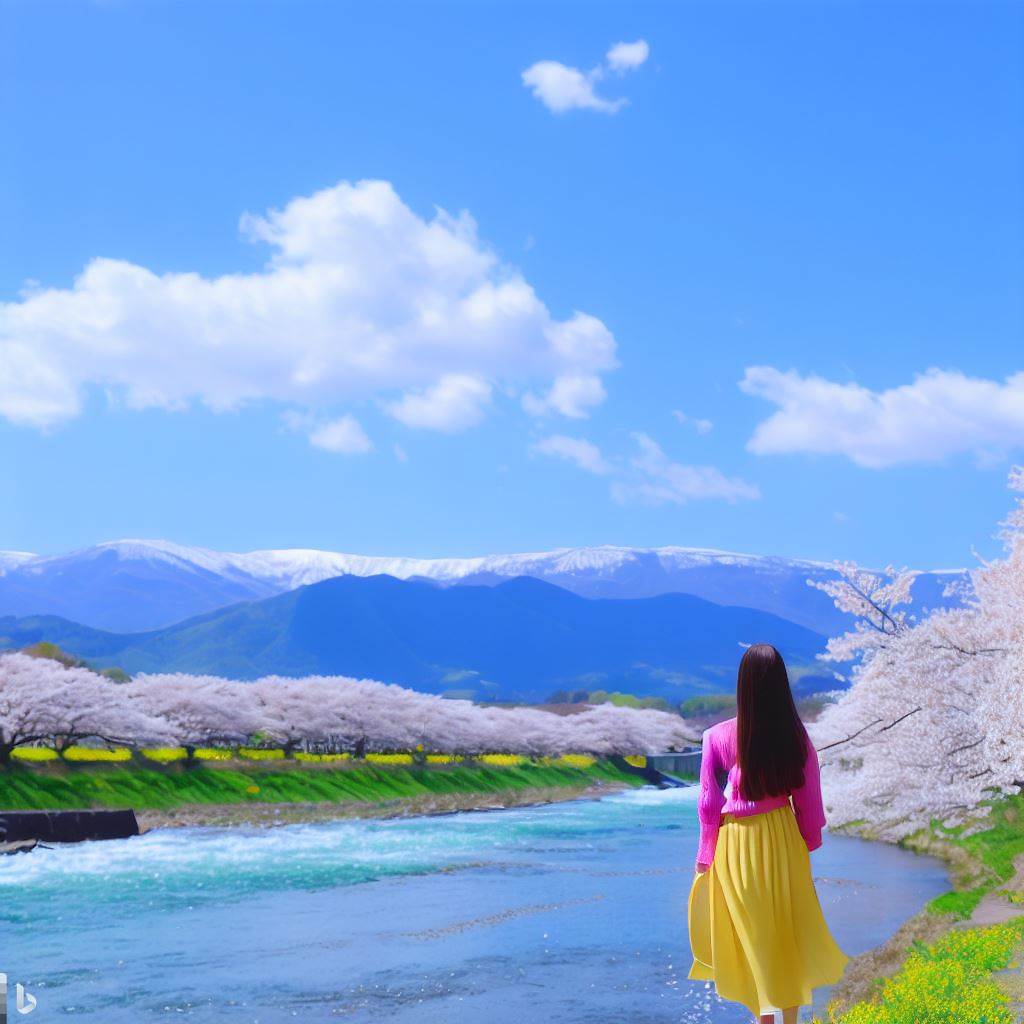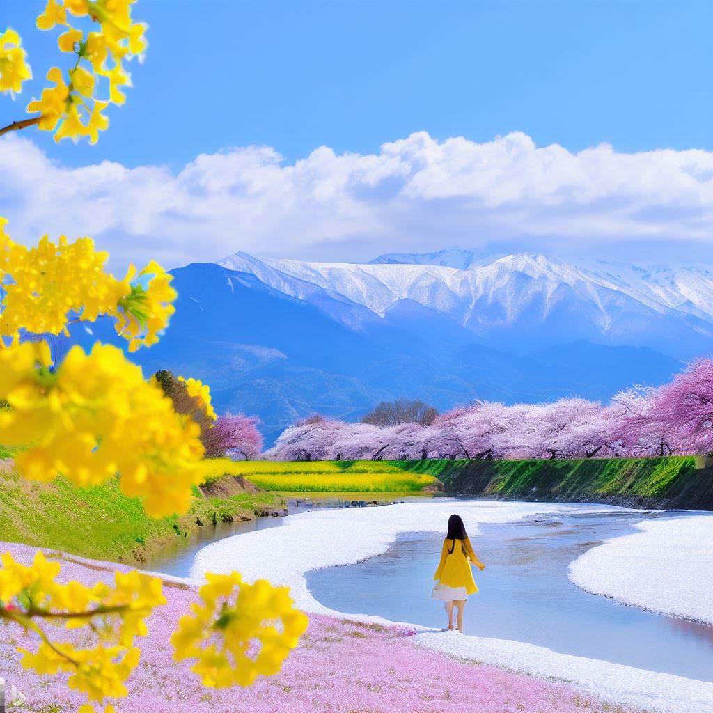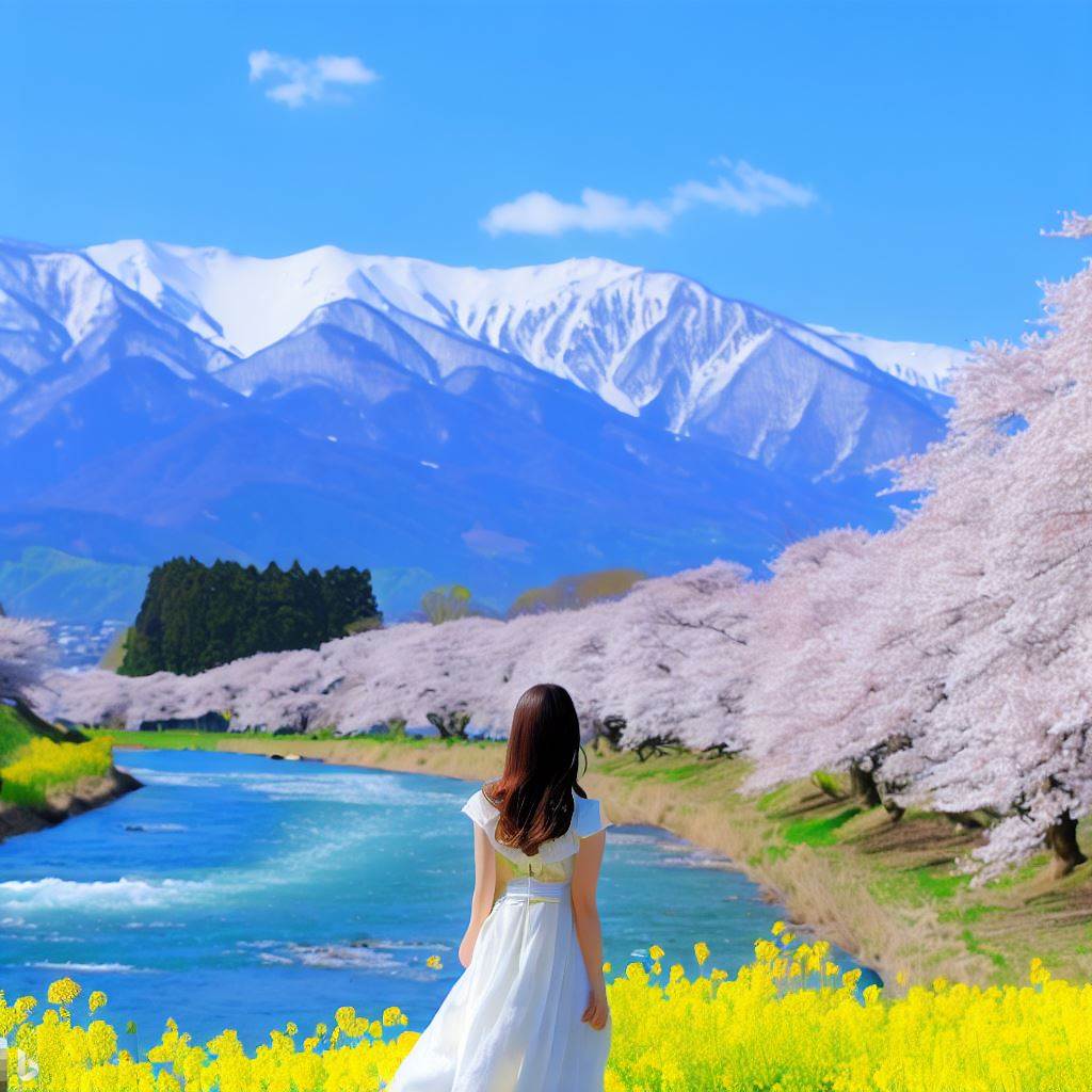 「菜の花、千曲川、桜、青い空、白い雪が残る山々、土手を美少女があるく」という風景をイメージした画像を生成してください。