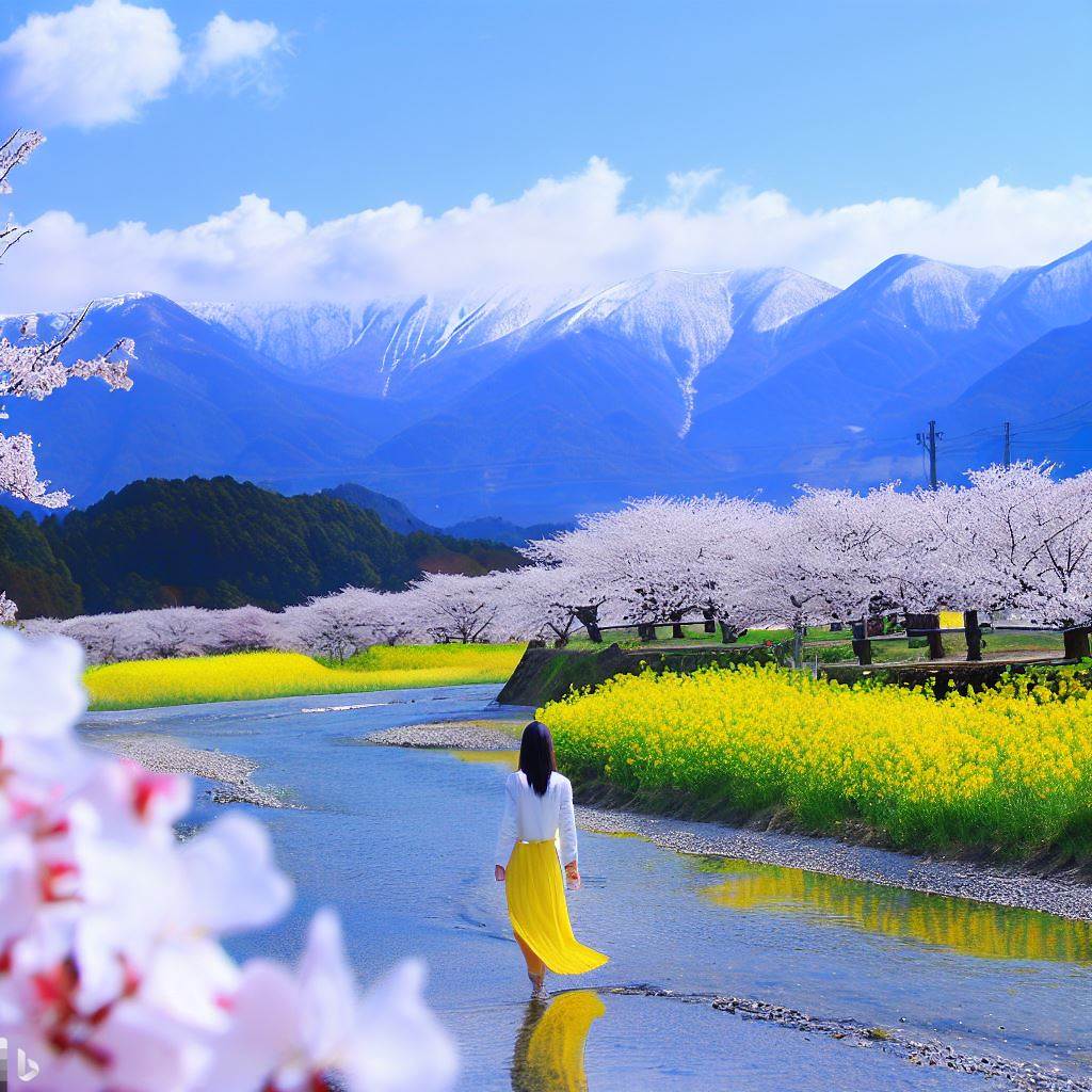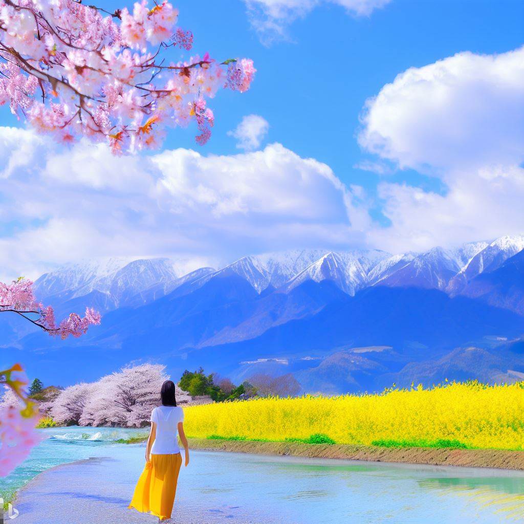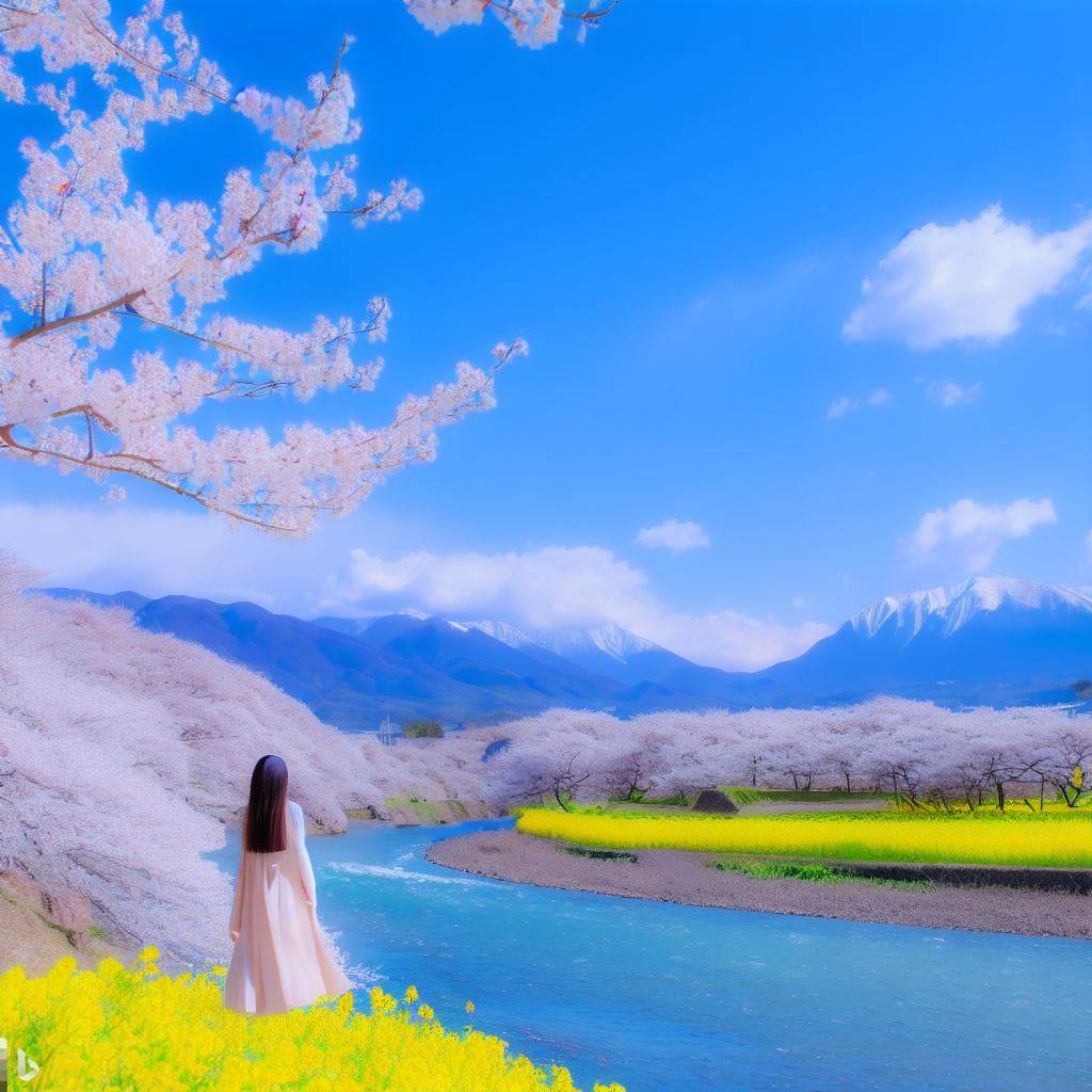 「Bing Image Creator」を使って画像を生成したい。「菜の花、千曲川、桜、青い空、白い雪が残る山々、土手を美少女があるく」を含むめて自然言語で呪文を作成して下さい