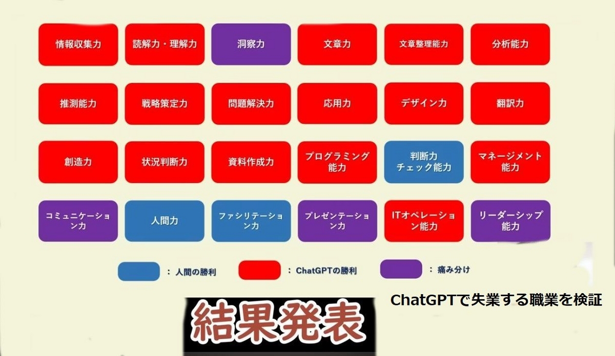 ChatGPTというもの凄いAIを今は無料で使いこなせる。ちょっと面白い動画をみつけました。業務の分野を分けて、人間とChatGPTでどちらが有利か不利かを細かく検証している動画です。殆どの分野がChatGPTが格段に勝っています。ショッキングな動画です。明日からの仕事どうするきっかけにして、ChatGPTと共存することが出来る人がこれから残っていく人でしょうね。