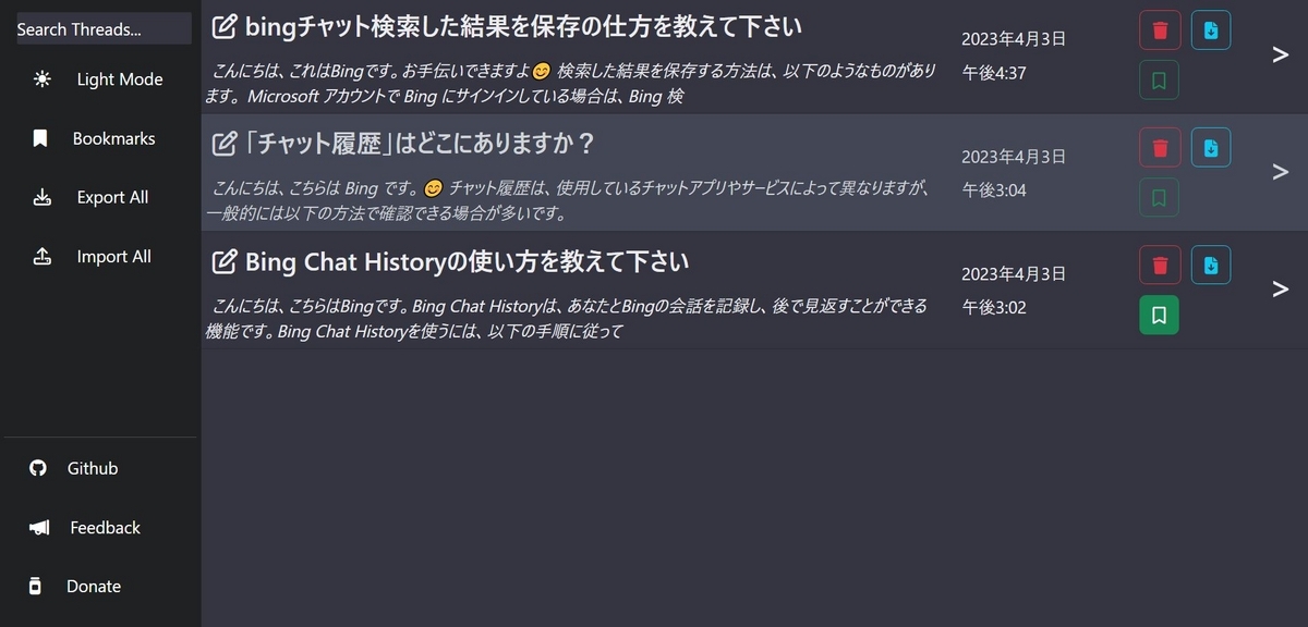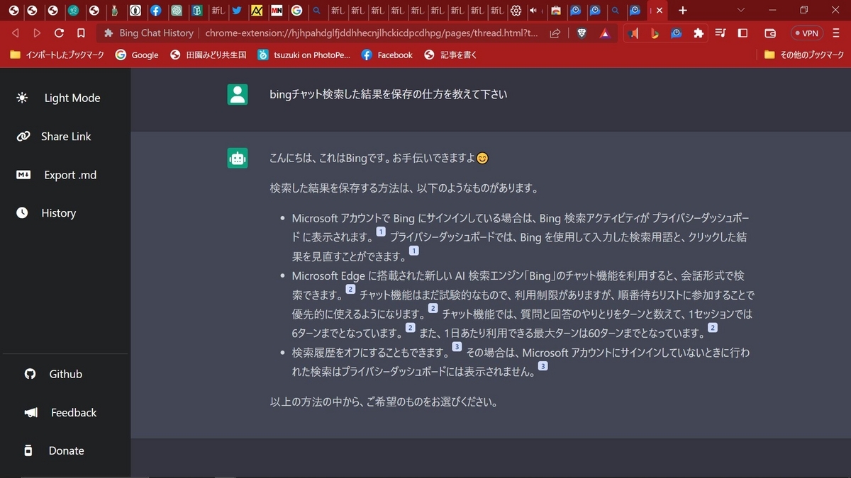 今回はBraveブラウザで「bingチャット検索」にアクセスしてみました。検索、会話の一部を保存してみました。「Bing Chat History」拡張機能で出来ます。これうっとうしいコピペが楽になりますね。