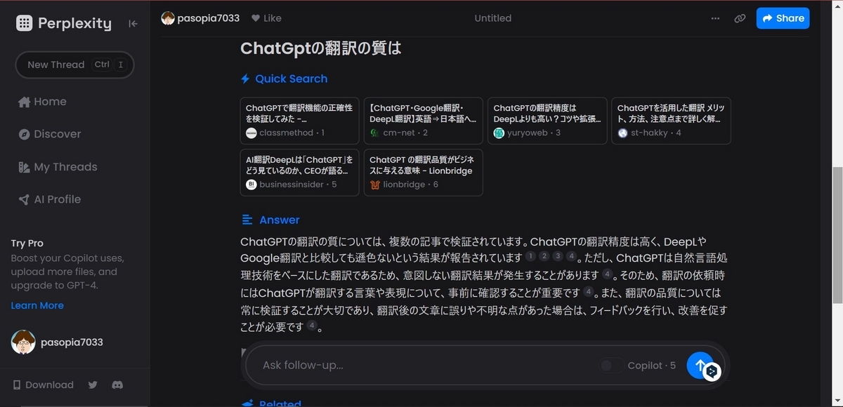 GoogleのChatGptです。解答の根拠を示すURLを表示もしてくれます。日本語の文章の質などは少し落ちますね。ChatGptと同じように使えます。