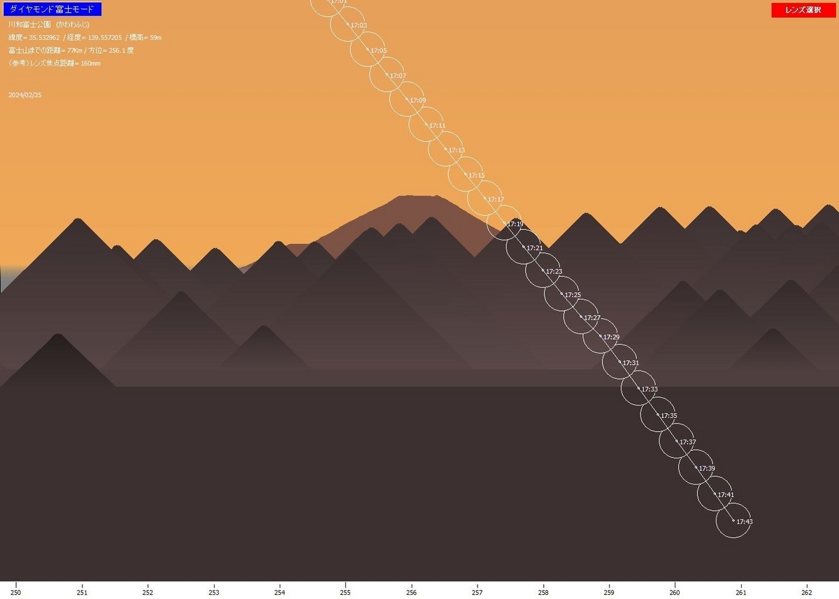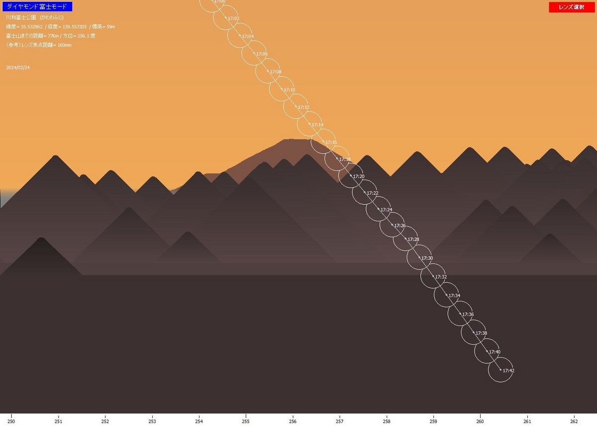 ダイヤモンド富士が富士山の山頂に都合よくぴったりと重なることはあまり期待できない。1日連れるとどれくらい違ってくるのか検証シミュレーションしてみました。例を川和富士公園2月23日(金)17:13にして前後の21日~25日の様子を1日前には左側、1日遅れでは右側にある角度をもって現れてきます。