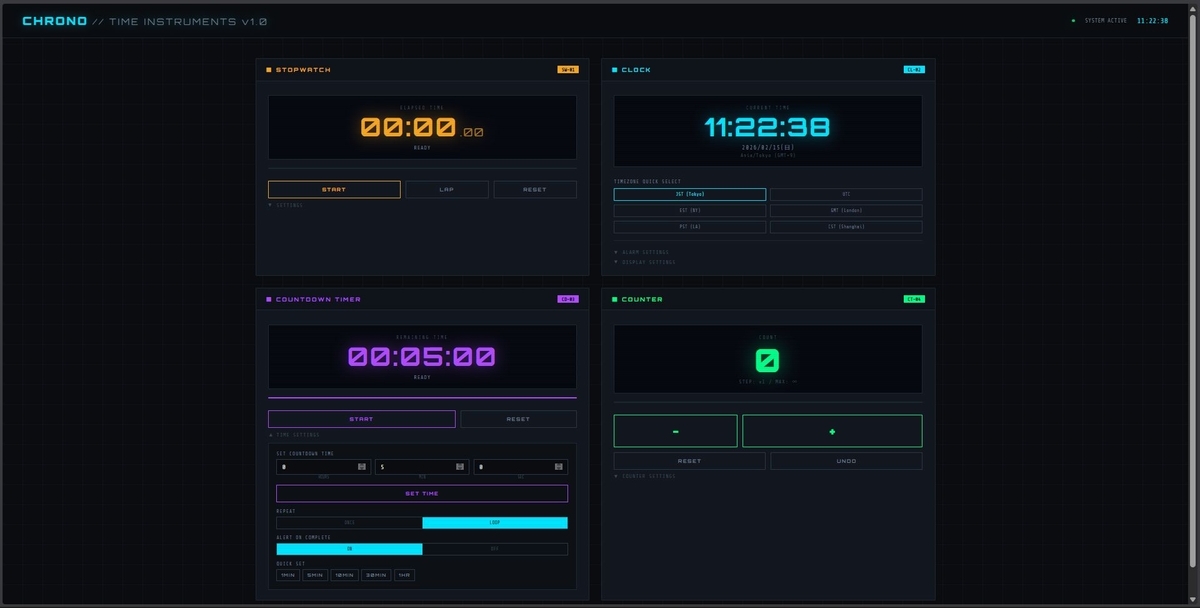 「ストップウォッチ、時計、逆算カウンタ、加算カウンタ」を開発しました。